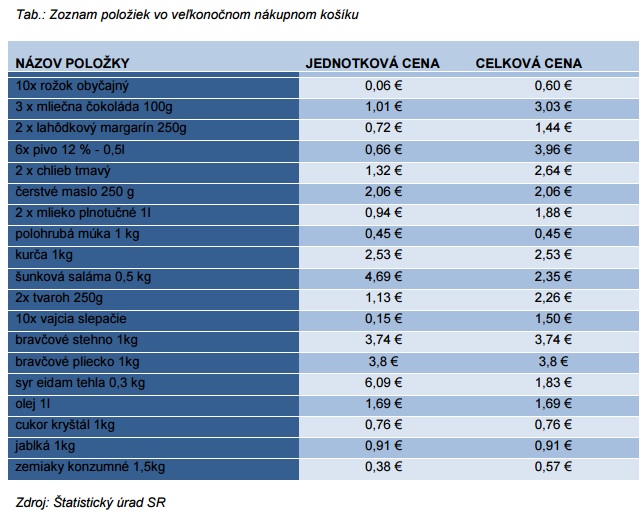 Za základný veľkonočný nákup zaplatíme v obchode 38 eur. „V porovnaní s vlaňajším veľkonočným nákupom zlacneli najvýraznejšie zemiaky, medziročne o vyše 40 percent. Výrazne menej zaplatia spotrebitelia aj za jablká (o 29 percent), kryštálový cukor (o 26 percent) alebo olej (o 13 percent ),“ hovorí v tlačovej správe analytička Poštovej banky Dominika Ondrová.