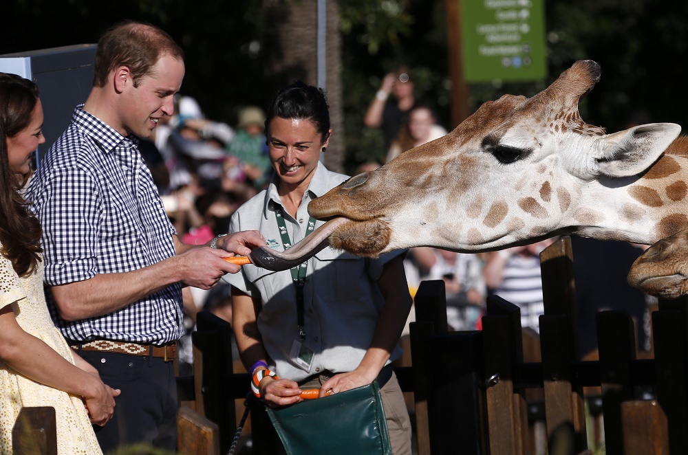 Britský princ William a jeho manželka vojvodkyňa Kate počas kŕmenia žirafy v Taronga Zoo v Sydney.